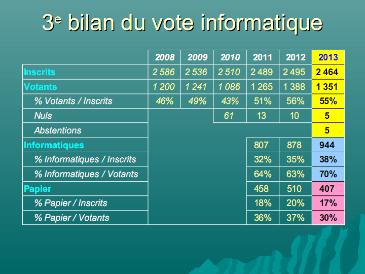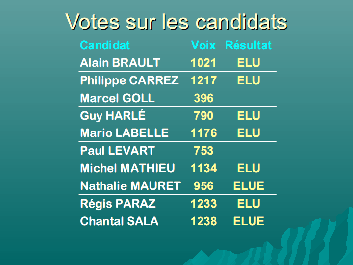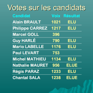 Le scrutateur en chef, Claude Mabillot, proclame les résultats des votes :