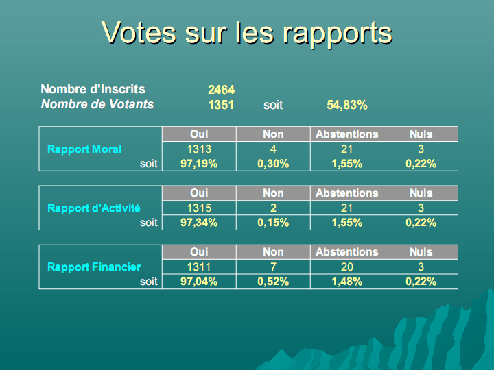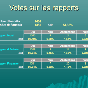 En l’absence des vérificateurs aux comptes, c’est Philippe Carrez qui lit leur rapport. Après quelques remarques mineures, ce rapport donne son satisfecit pour les comptes