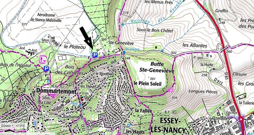 La rencontre se fera au col de Sainte-Geneviève sur la commune de Dommartemont (54310) à 6 km au Nord-Ouest de Nancy. L’accueil, le départ et le pot d’arrivée auront lieu sur le plateau de Dommartemont au bout de la rue du pain de sucre sur le grand parking repéré sur la carte avec la flèche noire.