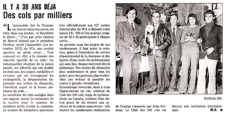 1973, le premier bulletin officiel du club paraît et Jean Perdoux en est le rédacteur. Marcel Bioud propose aux membres du Club des “Cent Cols” une première liste des cols routiers et muletiers des Alpes du Nord, suivie en 1974 par la liste des cols des Pyrénées établie par Francis Marty.