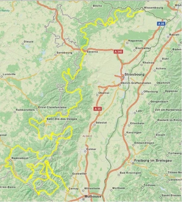 Da Wissembourg alla frontiera tedesca a Cernay vicino a Mulhouse, dei Vosgi arenari al nord ai Vosgi cristallini al sud, in dieci tronconi d’una lunghezza media di 80 km, si estende su 3 regioni (Alsazia, Lorena e Franche-Comté) percorrendo le strade di 6 dipartimenti (Basso-Reno, Alto-Reno, Mosella, Vosgi, Alta-Saône e Territorio di Belfort).