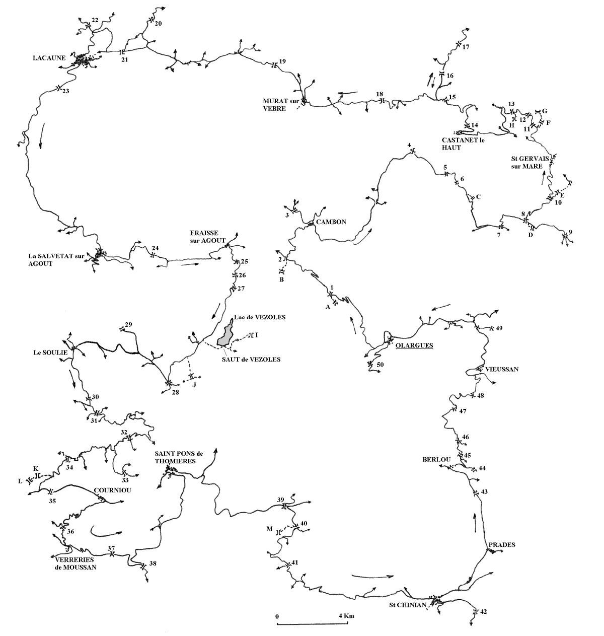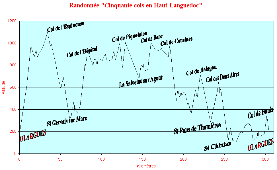 Pierre Gasc* nous propose une superbe balade dans la région du Haut-Languedoc. Cinquante cols agrémentent le circuit d'environ 300km se déroulant sur des routes très tranquilles, loin de l'agitation motorisée. Le circuit peut être effectué en deux boucles (ou plus) pour découvrir une région magnifique, très contrastée depuis les hauteurs de l'Espinouse et du Somail jusqu'aux plaines viticoles de St Chinian en passant par les trésors d'Olargues ou de St Pons de Thomières. Trois départements sont visités: l'Hérault, le Tarn et l'Aveyron.