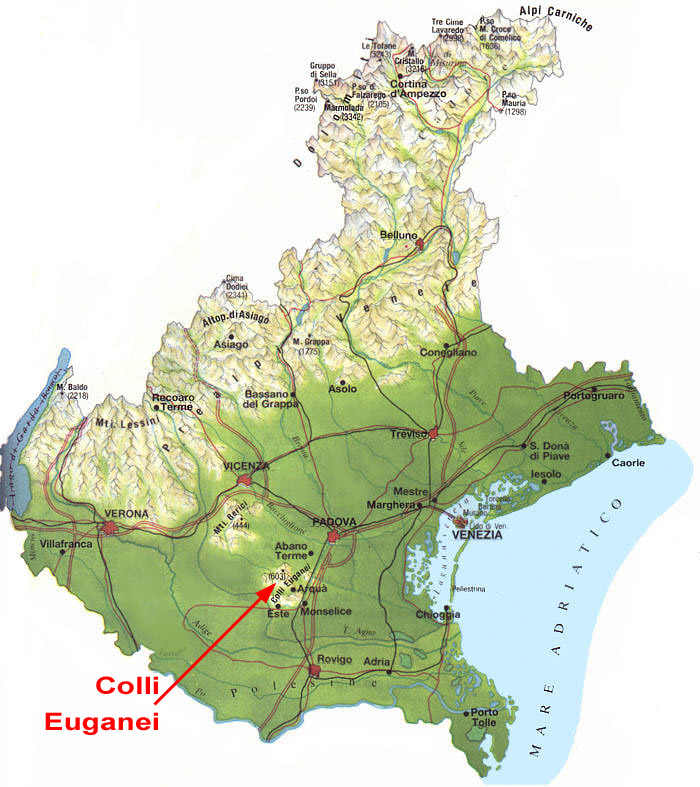 Très vite, il est apparu qu’il y avait, certes, un bon nombre de grands et beaux cols dans les contreforts des Dolomites au nord d’une ligne : Schio, Bassano del Grappa, Vittorio Veneto. Mais, j’ai aussi repéré une forte concentration de cols (presque une trentaine) dans un petit massif, haut comme trois pommes et grand comme un mouchoir de poche, émergeant de la plaine, à une vingtaine de kilomètres au sud-ouest de Padoue : les COLLI EUGANEI.