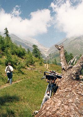 haute Ubaye. A droite, un sentier monte vers le lac Ste-Anne ou il rejoint le