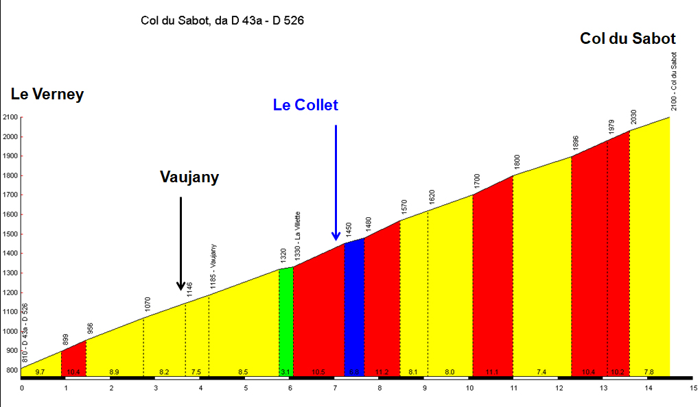 Par le sud-ouest, au départ du Verney (près de la Centrale Électrique de l’Eau d’Olle), du carrefour de la D526 (route de la Croix de Fer) avec la D43a (818 m) on accède au col du Sabot en 14,5 km. On traverse Vaujany ( à 10 km, alt. 1250 m) et passe par Le Collet FR-38-1400 (à 7,7 km).