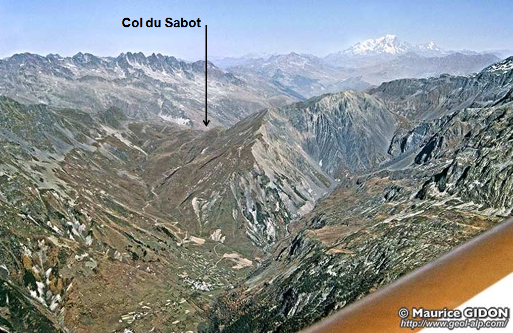 Légende de l’auteur « La bordure nord-ouest du massif des Grandes Rousses sur le versant sud du col du Sabot, vue du sud, d'avion, depuis l'aplomb de Sardonne. » (avec à l’horizon … le Mont-Blanc)