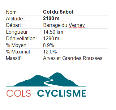 Le Col du Sabot (FR-38-2100b) est le seul col plus de 2000 m revêtu du département de l’Isère … et de plus il ne l’est que sur un seul versant.