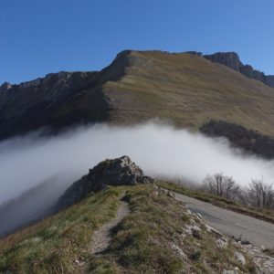 - sous la mer de nuages, la vallée de la Drôme vue du col de Vassieux. Au soleil les Trois Becs.