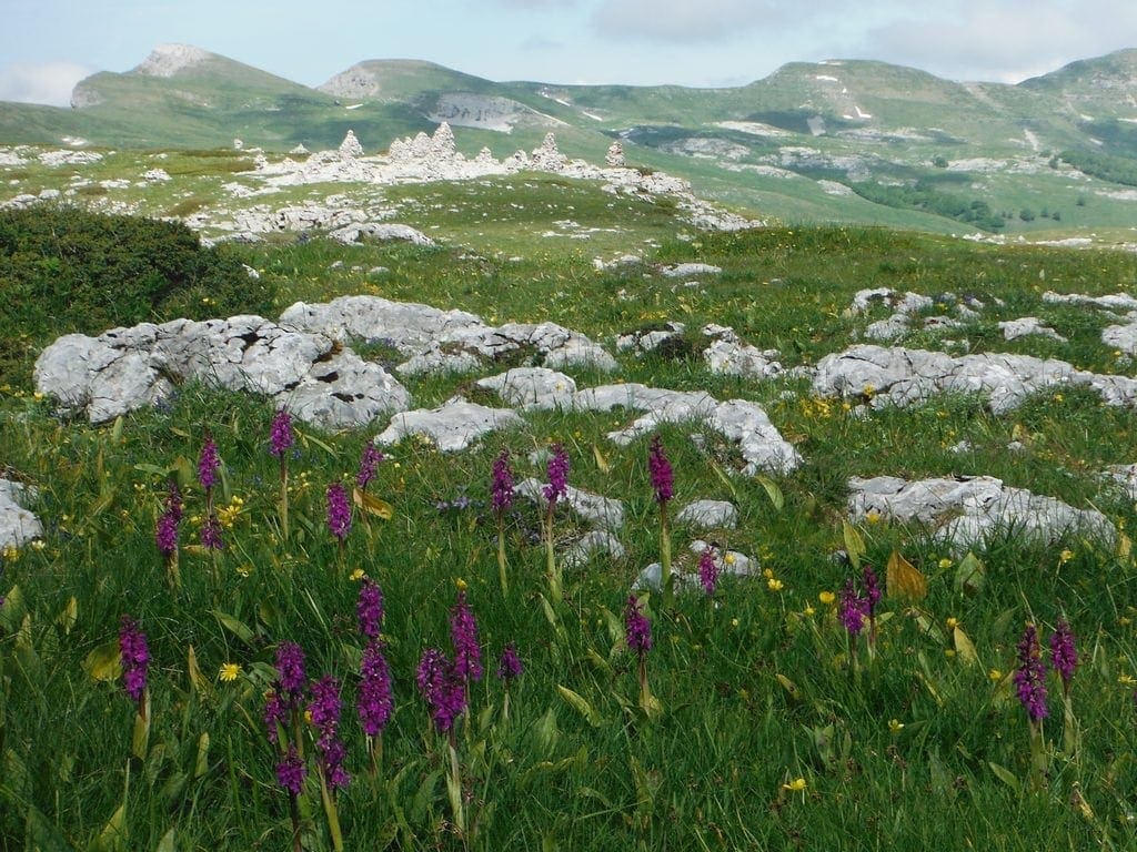 Le plateau est superbe au printemps, quand la couverture végétale, entre les dalles cannelées des lapiaz, les barrières rocheuses et les scialets, se pare de narcisses et d’orchidées.