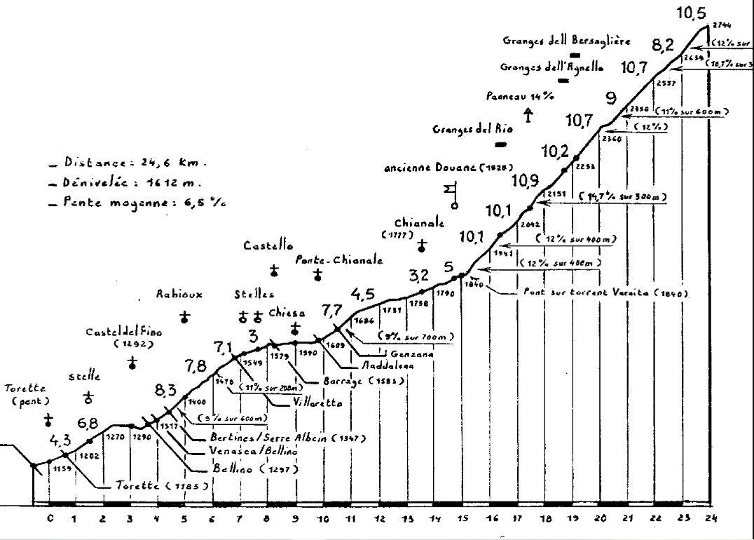 Mais, plus que son altitude ce sont ses pourcentages élevés qui impressionnent, notamment dans les neuf derniers kilomètres après le pont sur le torrent Varaita, où le cycliste sera confronté à une formidable muraille à 10% de pente moyenne, mais où souvent la pente oscille entre 11 et 12%. Le morceau de bravoure se situe au kilomètre 17,5 après une épingle à droite, où une rampe à plus de 14% sur 300 m permet de franchir l’échine de la Costa Ciais, contrefort du Pic d’Asti, bien visible vers le nord-est, alors que la route remonte en longues portions rectilignes le vallon de l’Agnel. On aborde ensuite une série de huit lacets, ponctués d’un court replat (3% sur 300 m), après le vingtième kilomètre. Ce sera là le seul endroit pour souffler un peu avant d’aborder 3,3 kilomètres très difficiles oscillant entre 11 et 12% ! Les trois cents derniers mètres avant le col se négocieront seulement à 6,6%. À noter que cette muraille de neuf kilomètres se situe à une altitude comprise entre 1840 m et 2744 m, ce qui accroît encore l’effort à fournir pour progresser…