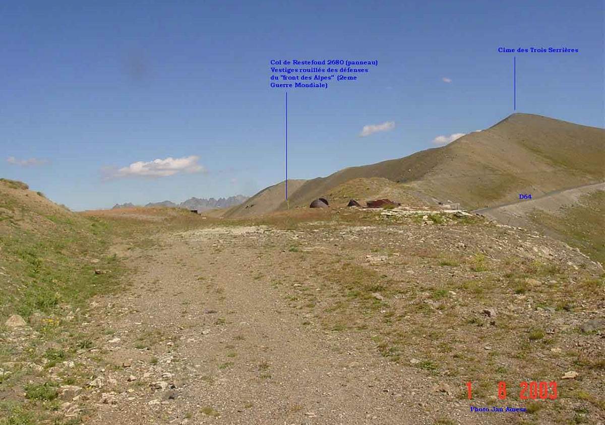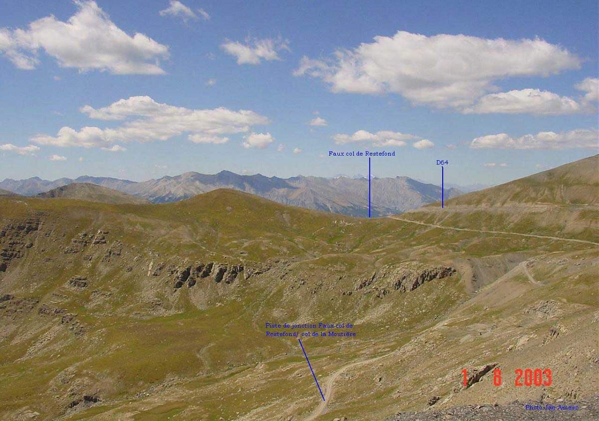 300m au-delà de l’embranchement de la piste conduisant au col de la Moutière, s’ouvre sur la gauche, cette fois, une piste R1-2, qui permet d’atteindre le col de Restefond (FR-04-2692b) altitude 2680m. Ce col est légèrement au-dessus de la D64. Le nom du col est indiqué par un panneau sommital. Des vestiges des combats de la Deuxième Guerre Mondiale sont encore visibles aux alentours.