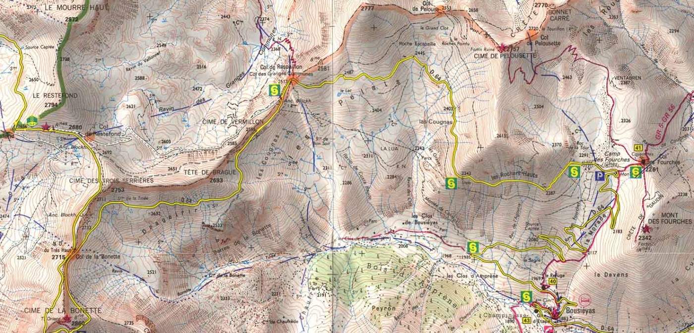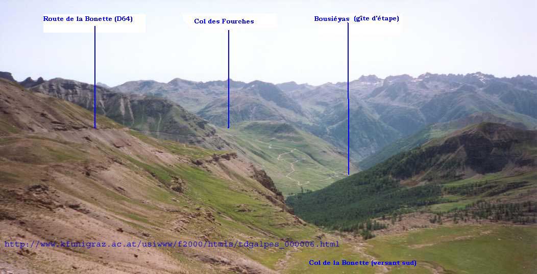 Le col de la Bonette s’ouvre à gauche cette fois, puis, dans la descente, on franchit le col de Raspaillon ou des Granges Communes (FR-04-2513). Enfin, quatre kilomètres plus loin, juste après les ruines du camp des Fourches, une piste R1 part sur la gauche pour atteindre sans difficulté le col des Fourches (FR-06-2261b), à 200m du goudron.