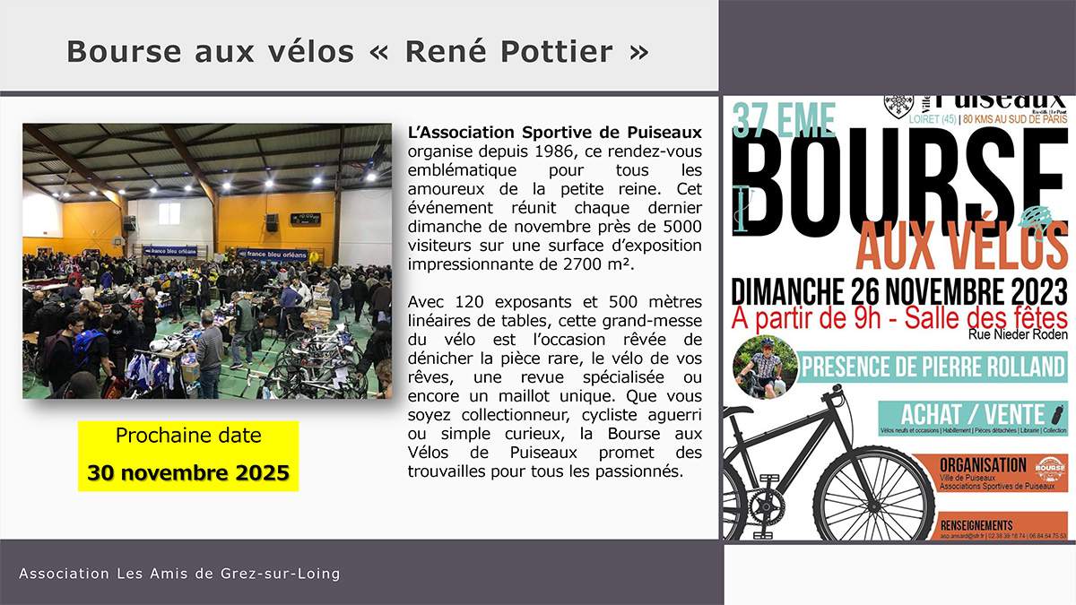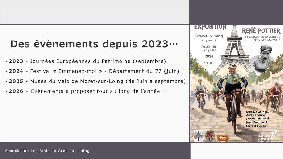 El jueves 05 de febrero se celebrará una reunión por videoconferencia entre Christophe Ligere, de la Association des Amis de Grez-sur-Loing, Gérard Rodriguez, Presidente del Cyclo sportif de Brétigny-sur-Orge (CSB) Cyclotourisme, Denis Mathieu y Christophe Badonnel, del Club des Cent Cols, para preparar este acontecimiento. Los detalles de la jornada del sábado 4 de julio se anunciarán más adelante.