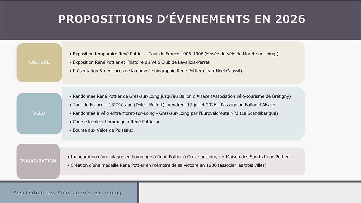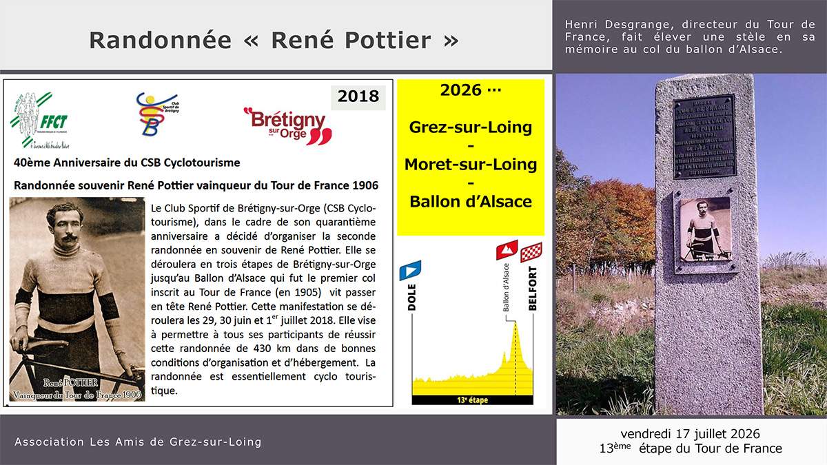 El Club Sportif de Brétigny/Orge (CSB) de CYCLOTOURISME organiza del 02 al 04 de julio un recorrido limitado a 40 ciclistas, de Brétigny/Orge al Ballon d'Alsace, pasando por el lugar de nacimiento de René Pottier. La carrera se celebra en su honor y se denomina «La René Pottier». Esta será la 4ª edición (2006-2018-2019 y 2026). Ciclo CSB